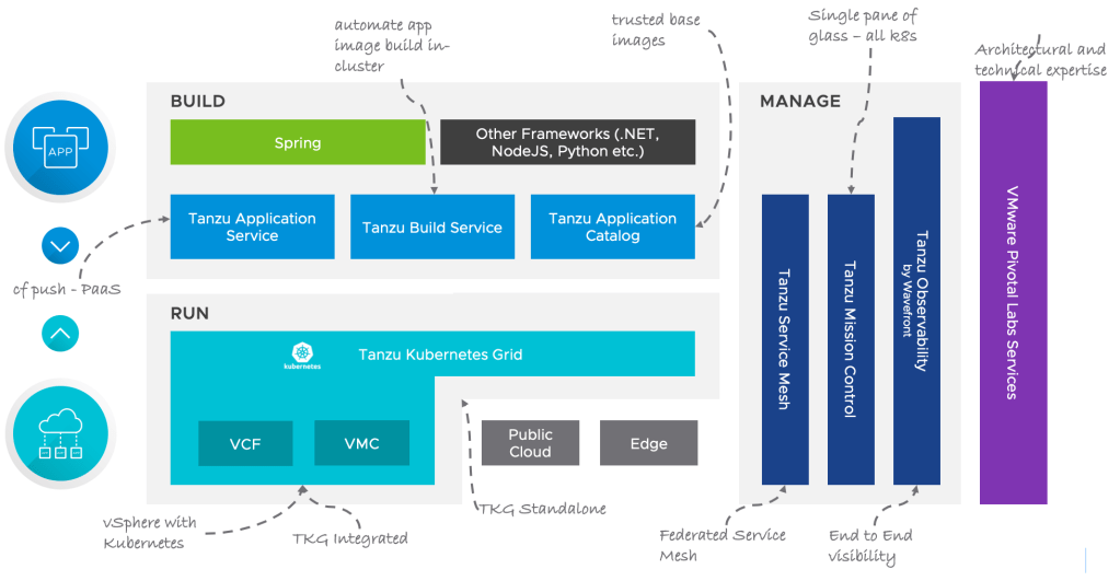 * TKGI (Tanzu Kubernetes Grid Integrated)– Fully Managed K8s as a Service on any private/public Cloud. The great opinionated choice for day 2 operation, because its operation is fully automated.